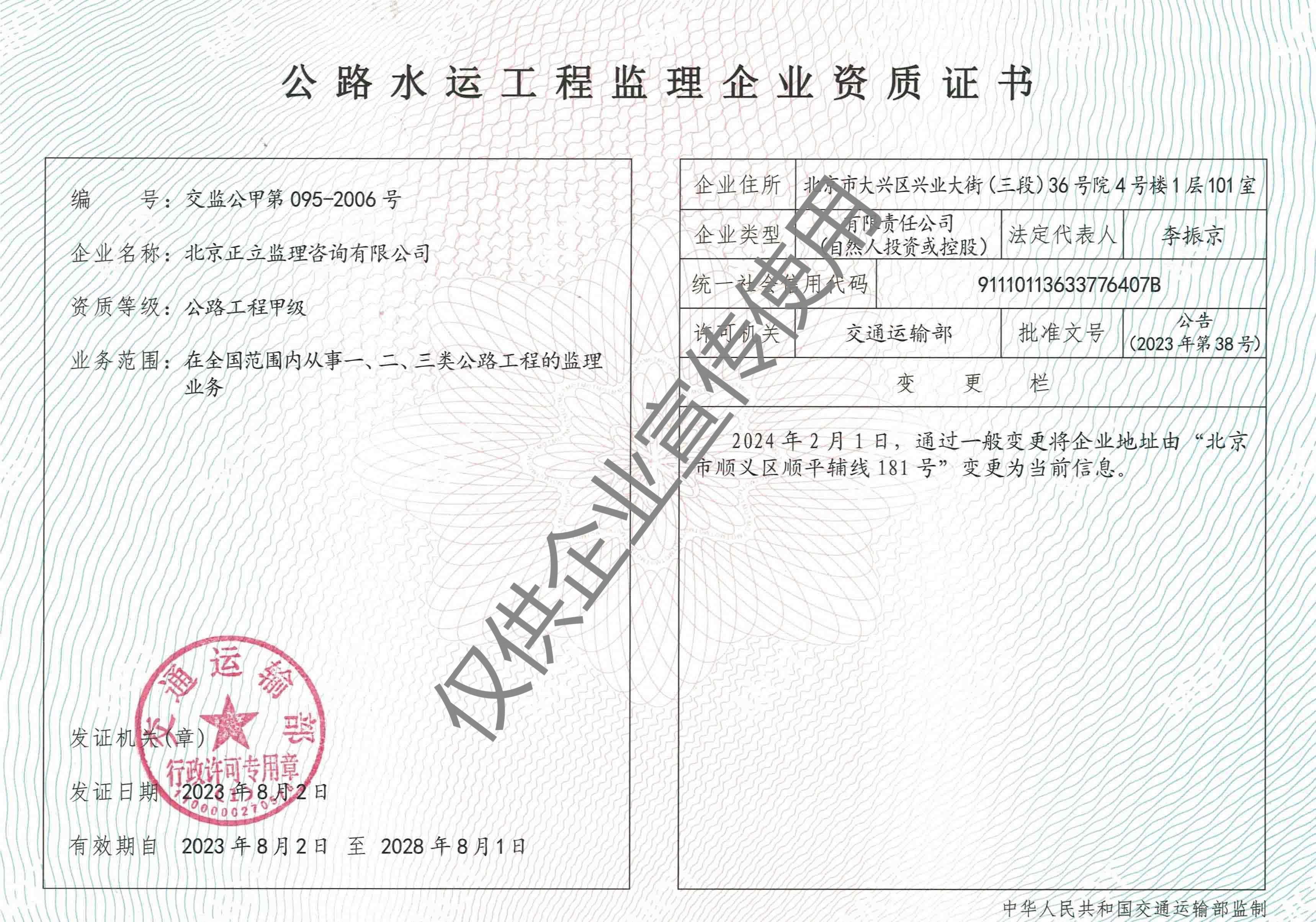 北京正立監(jiān)理咨詢有限公司成立于1998年7月1日,其前身隸屬于北京市公路質(zhì)量監(jiān)理站。具有獨立法人資格,是獨立核算、自負(fù)盈虧的經(jīng)濟實體。企業(yè)經(jīng)營范圍:公路工程監(jiān)理、交通工程監(jiān)理、市政公用工程建設(shè)監(jiān)理、工業(yè)與民用建筑工程監(jiān)理、工程監(jiān)理咨詢、技術(shù)咨詢、技術(shù)培訓(xùn)等。